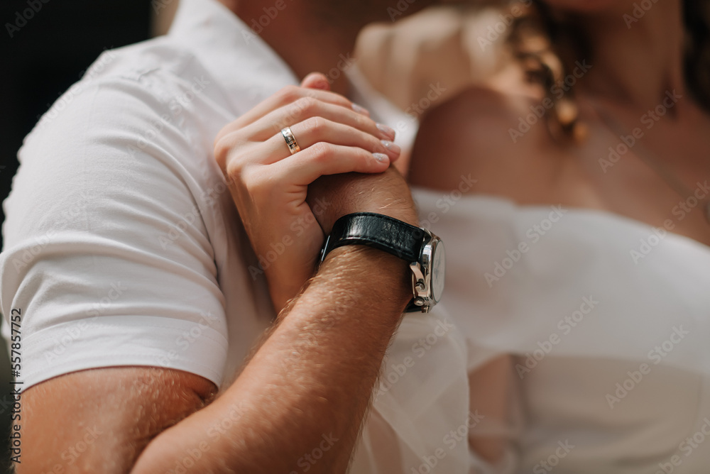 Bride and groom hands with wedding ring