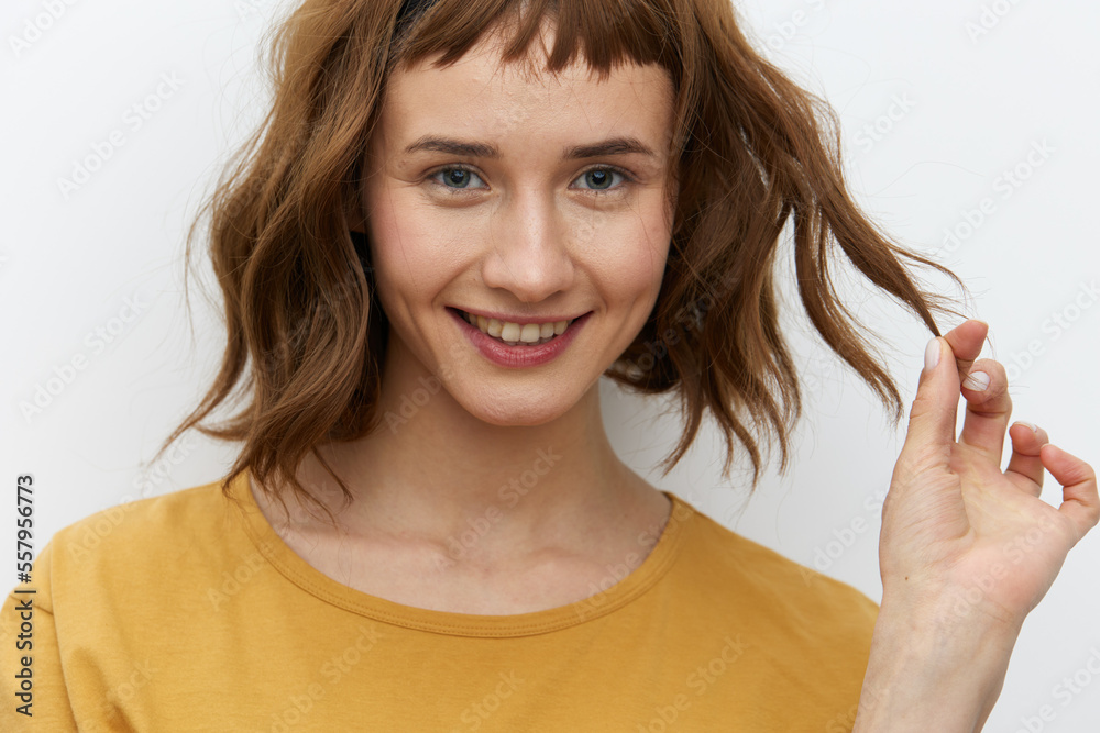 a close, horizontal portrait of a happy, beautiful, attractive red-haired woman playfully pulling back a lock of her well-groomed hair