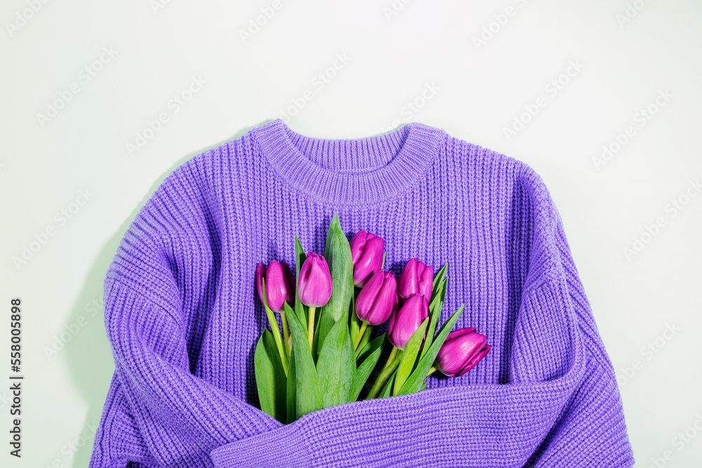 Bouquet of purple tulips wrapped in sweater. International Women's Day, March 8, birthday, Valentine's day concept. Wool sweater hugging flowers. Top view, flat lay