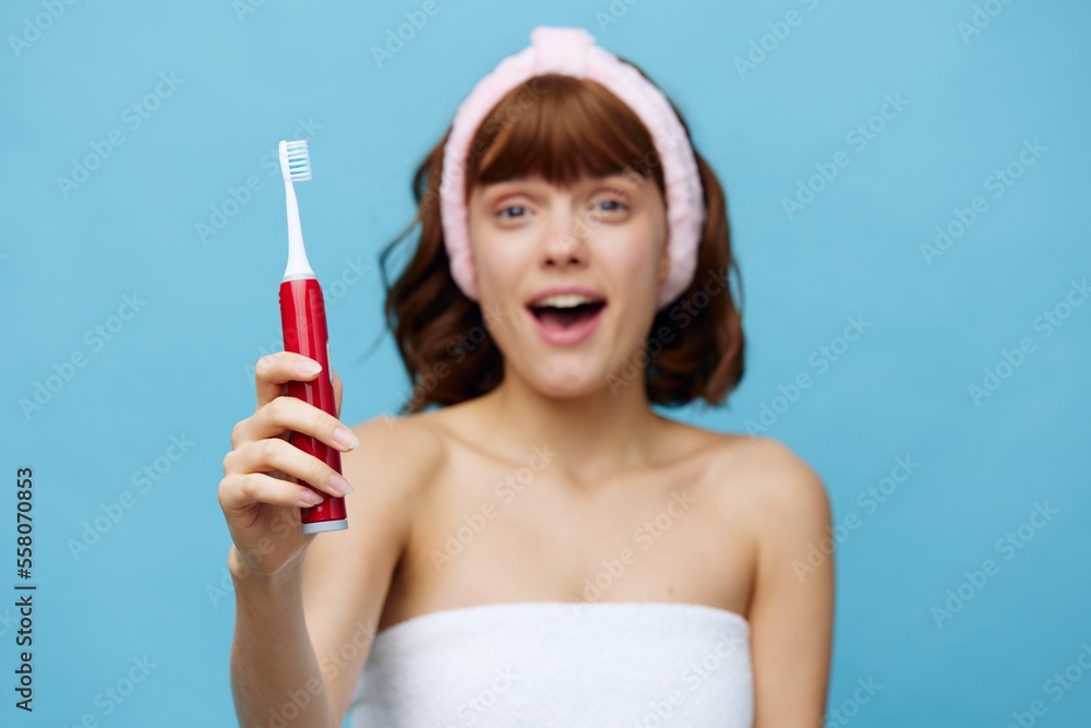 a pleasant, happy woman stands on a blue background in a towel, smiling happily and holding a red electric brush in her hand