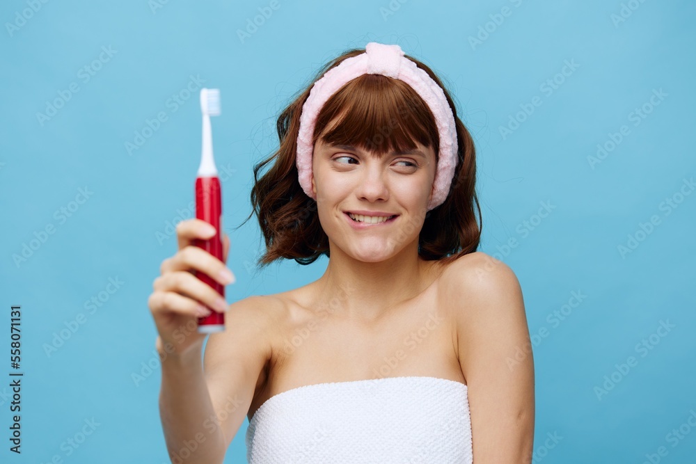 a joyful, pretty woman holds a red toothbrush in her hand, standing on a blue background and looking away, smiling happily