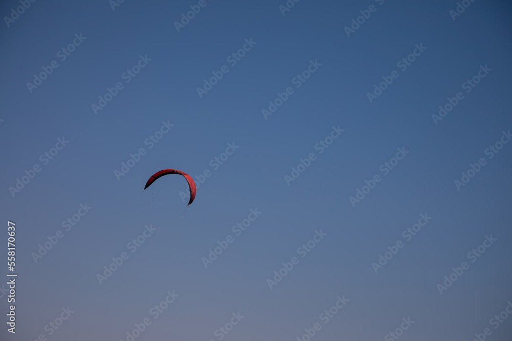 Red kite on blue sky. Nice parachute. Colorful sky. Sunny summer day. Wind in the sky.