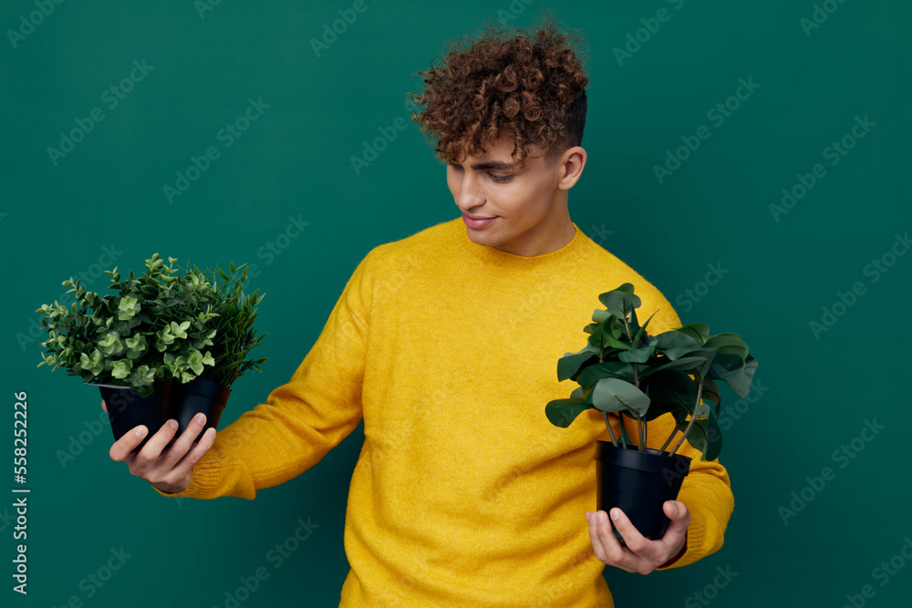 a relaxed man with curly hair, standing on a green background and holding potted houseplants in his hands, looking at them