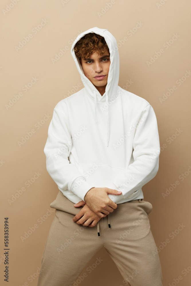 vertical photo of a stylish young man in a white hoodie standing on a beige background in a relaxed pose