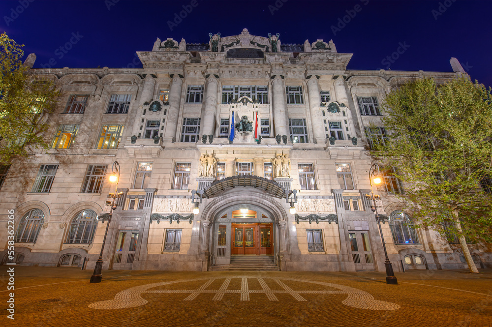 Facade of the Franz Liszt Academy of Music in Budapest, Hungary at night. A concert hall and music conservatory in the city founded in 1875