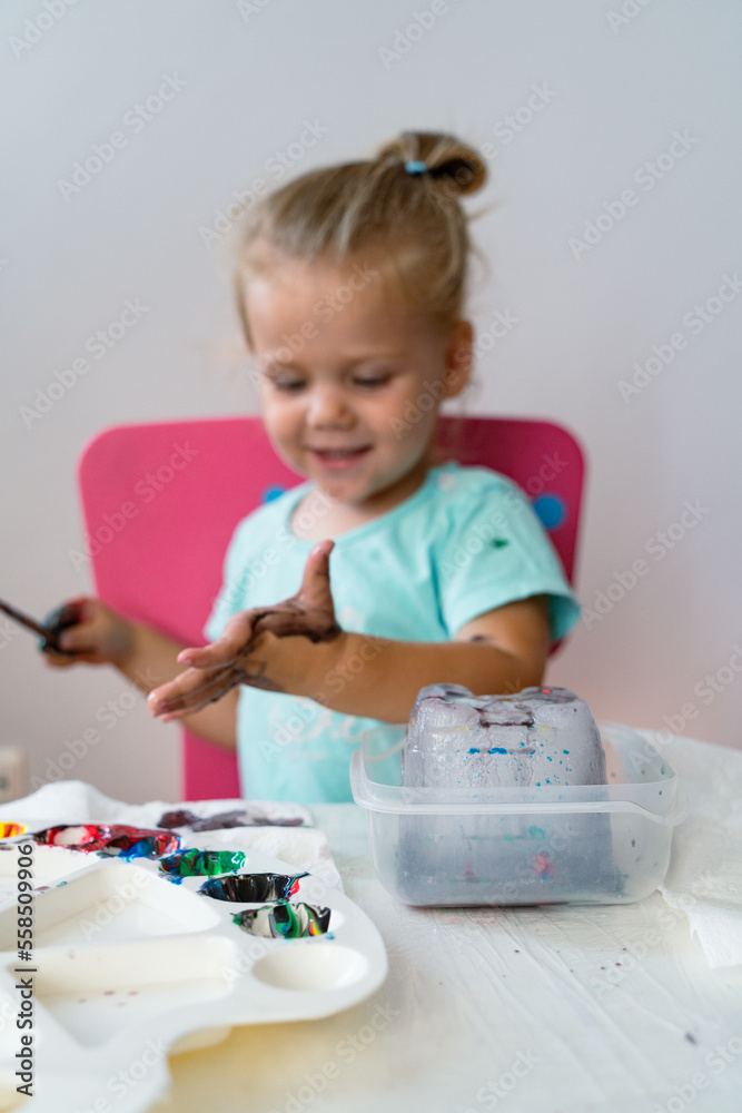 а little girl paints an ice castle with colored paints and she is very happy with the process of painting a girl in a blue t-shirt with the inscription "my light" in German, a child sits at a table