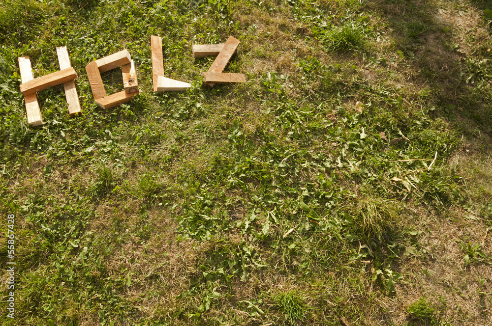 Wort HOLZ aus Holz geschrieben im Gras