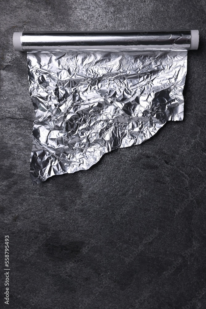 Roll of aluminum foil on grey table, top view. Space for text