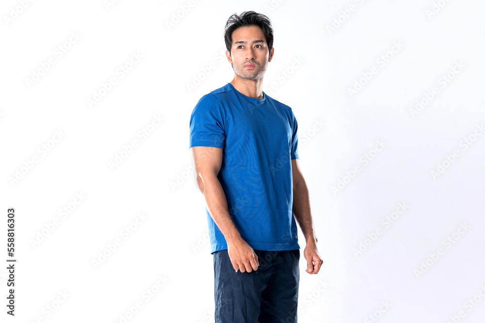 Elegant young man in blue shirt standing on white background