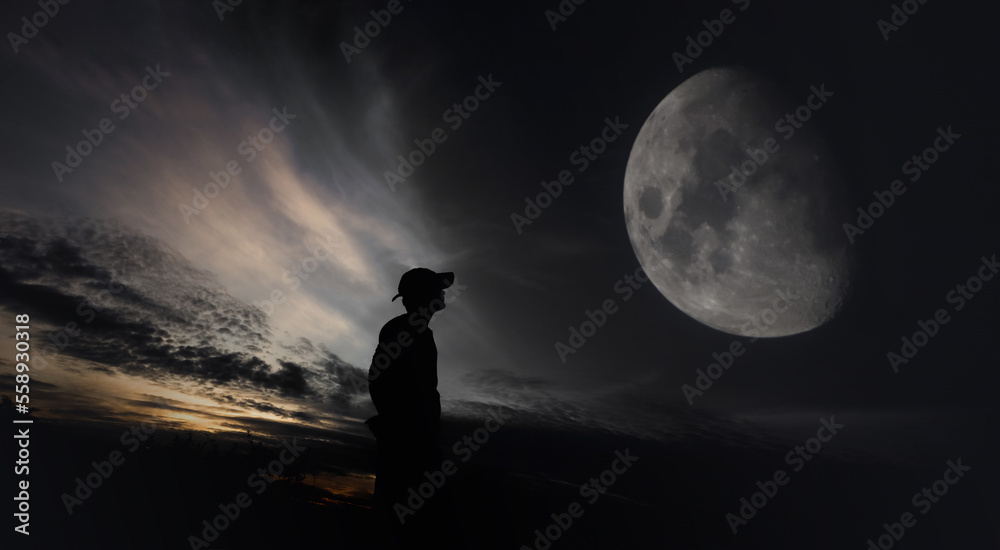 a person silhouetted against a cloudy night sky with a large, bright moon.