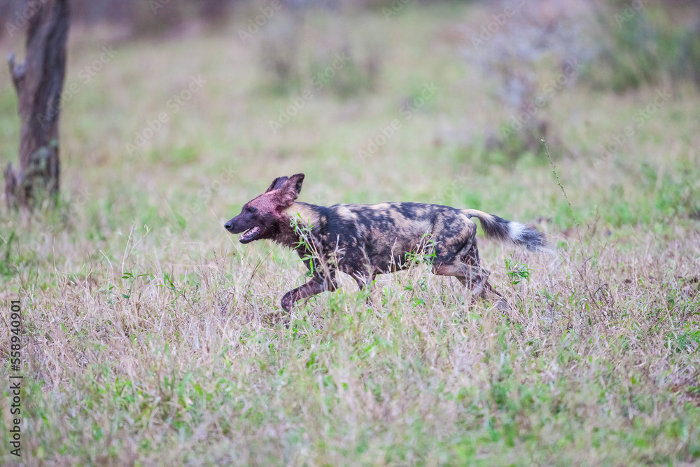 African wild dogs begin to eat their prey without killing it. they are under protection
