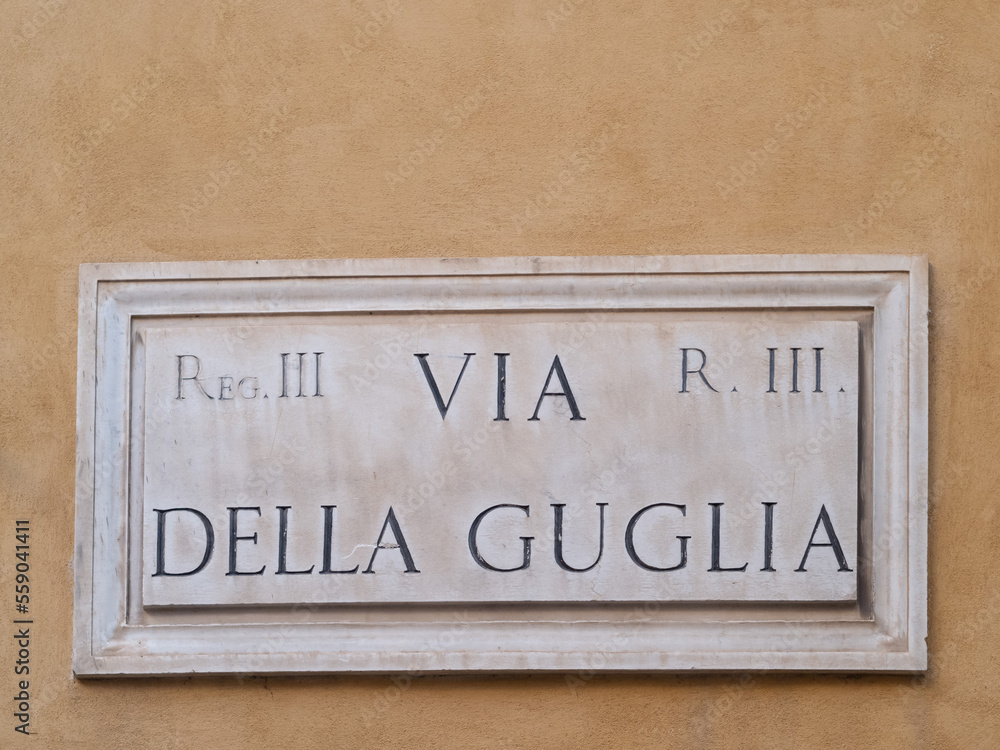 Street sign, "via della Guglia" in Rome, Italy, marble plate on wall.