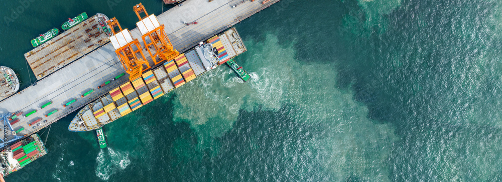Crane loading cargo box to Large container Ship at Cargo Sea Port. Freight shipping container box transportation and logistics to Customs sea port.