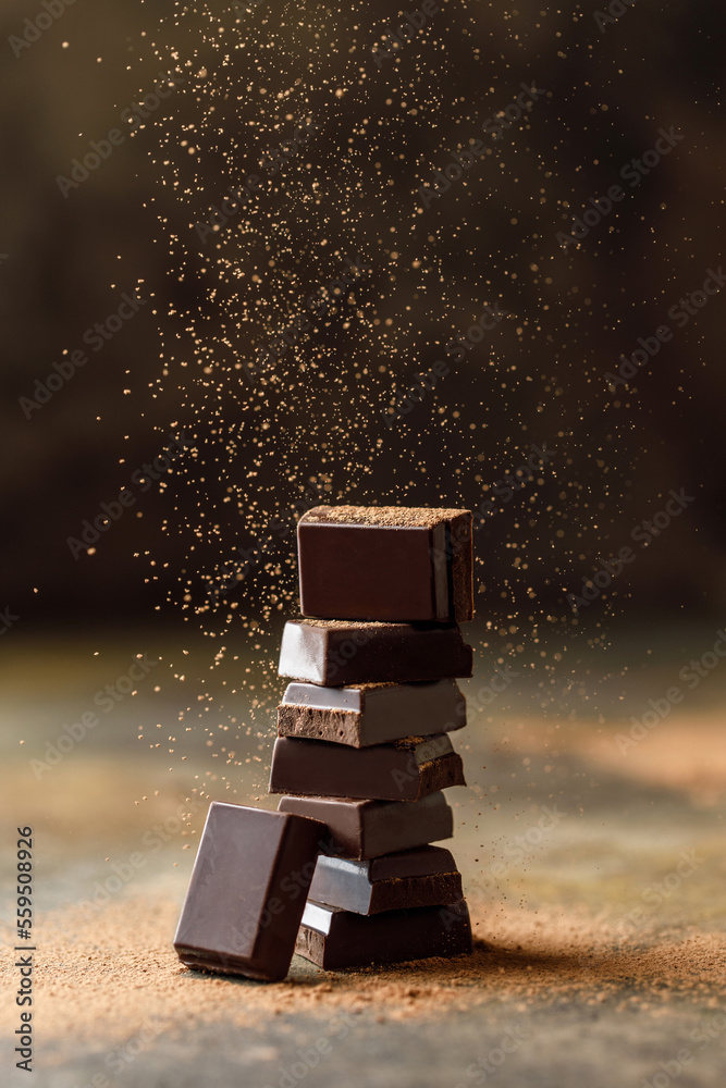 Broken chocolate pieces on dark background. Stack of dark chocolate. Chocolate concept