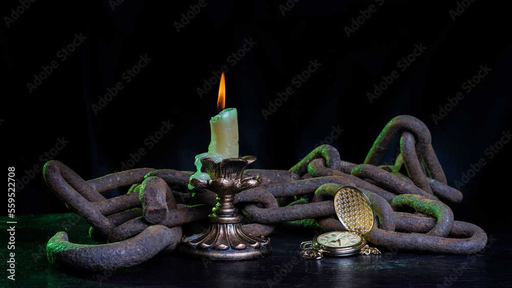 A burning candle in chains on a wooden table and a clock that has stopped time.