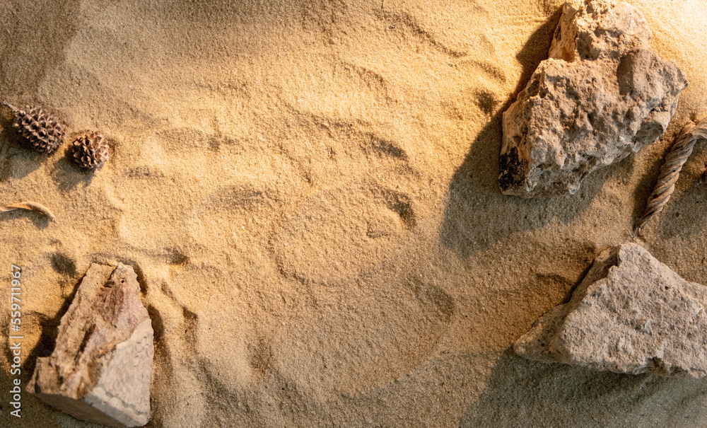 Summer composition. Nature display. Desert scene. Uneven stone frame arrangement on beige beach sand texture free space decorative background.