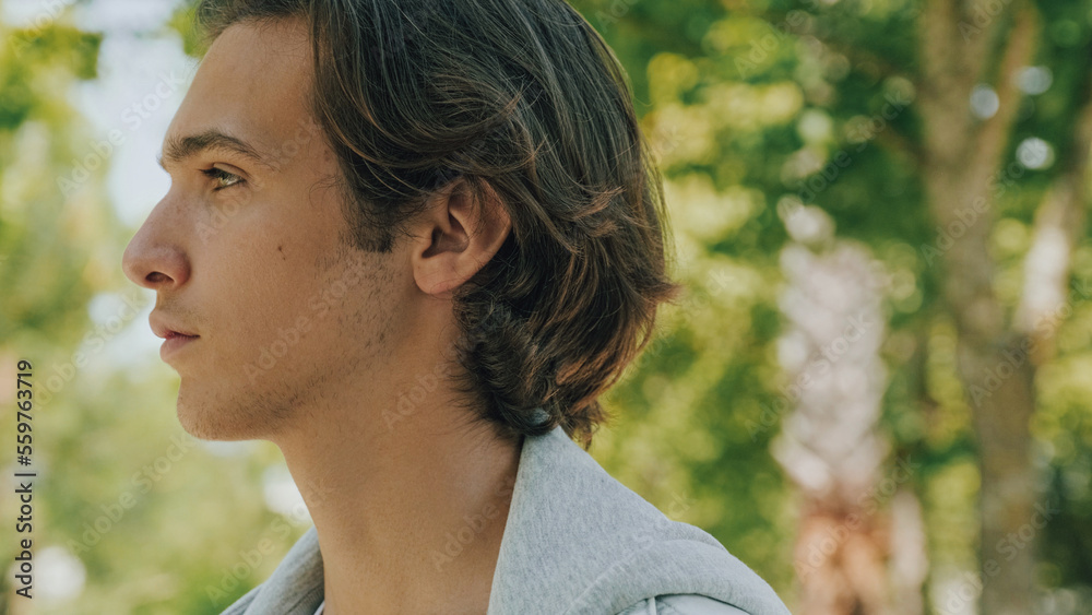 Confident teenager is looking away, outdoor portrait. Handsome face of a male model with brown hair at city. Closeup profile portrait of handsome confident young man at the park in summer.