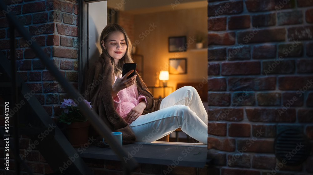 A Beautiful White Woman is Using her Smartphone While Sitting on her Windowsill at Night With a Fleece Blanket. Young Female Smiling While Browsing Through Potential Matches in an Online Dating App