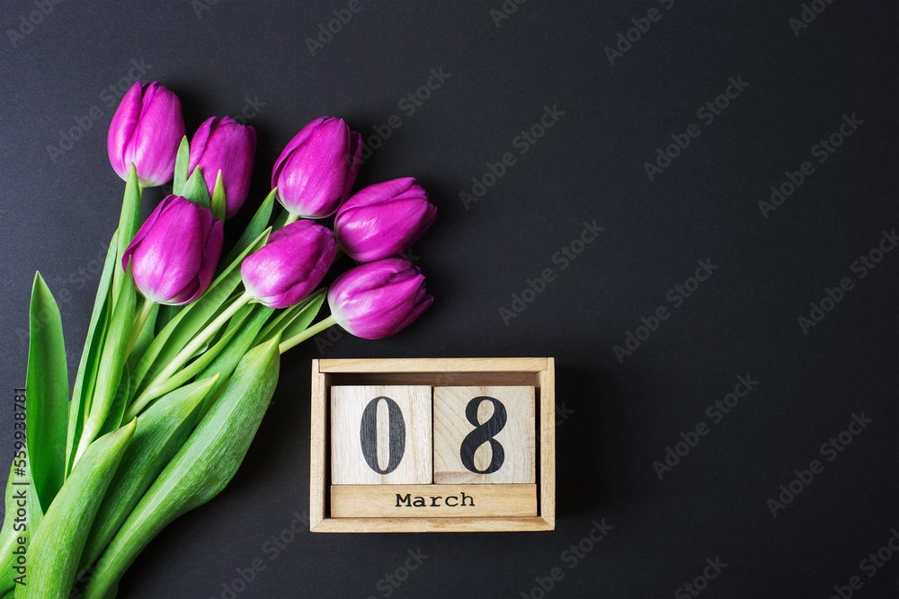 Bouquet of purple tulips and wooden block calendar with 8 march date on black table. Womens day holiday concept. Top view, flat lay, copy space