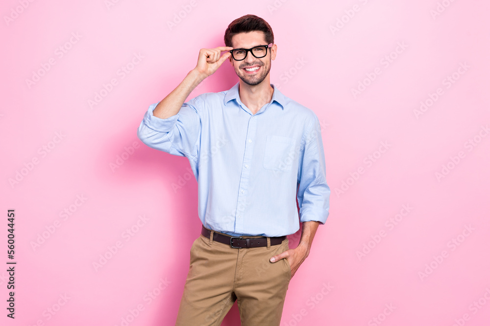 Photo of clever smart good looking man hand hold glasses wear trendy clothes isolated on pink color background