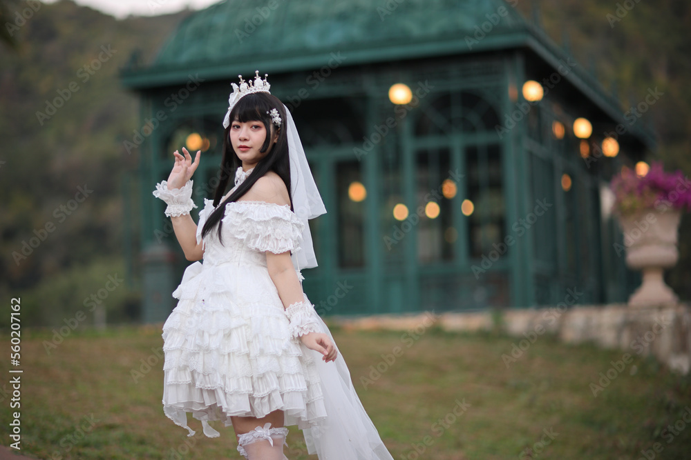 Beautiful young woman with white lolita dress with european garden Japanese fashion