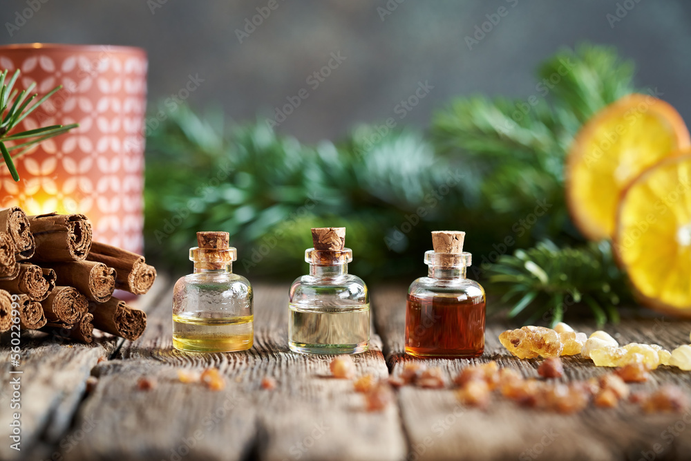 Christmas essential oils with frankincense, myrrh, cinnamon and fir