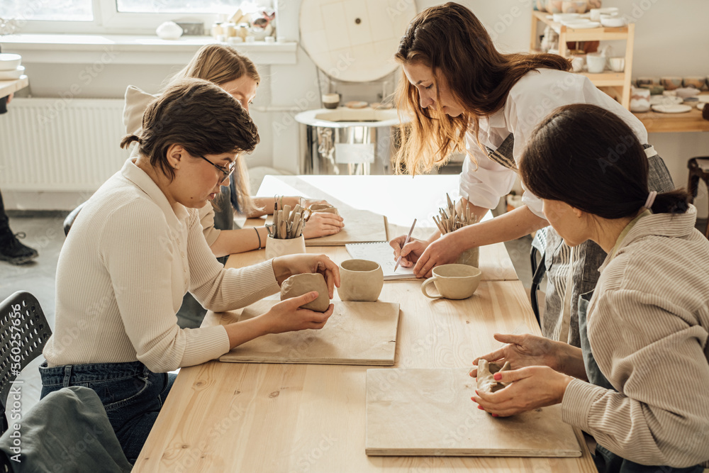 Portrait of young woman teaching apprentices making ceramics in pottery workshop