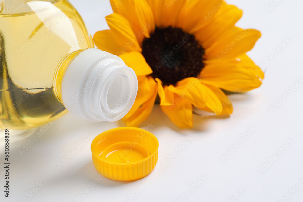 Bottle of cooking oil and sunflower on white table, closeup
