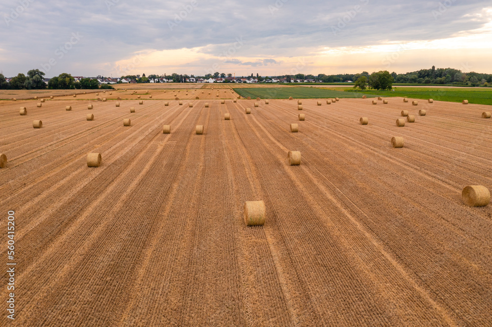 A field with hay bales after the harvest with a view of further fields and a village in backlight