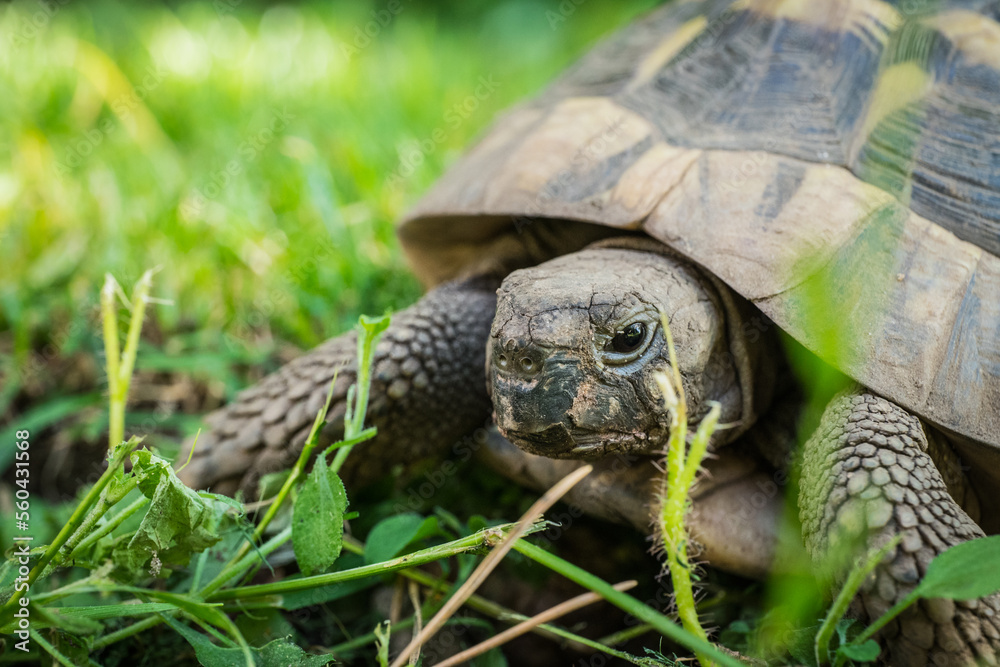 Eastern Hermann's tortoise, European terrestrial turtle, Testudo hermanni boettgeri, turtle on the lawn in nature