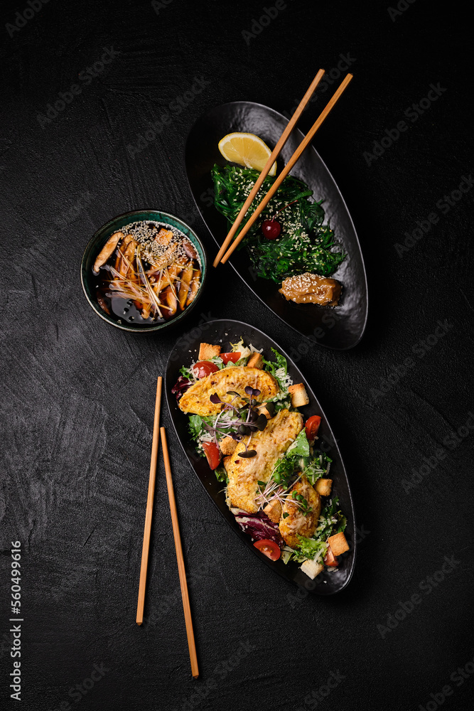 Chuka wakame, Cesare salad and Miso soup and chopsticks in japanese stile