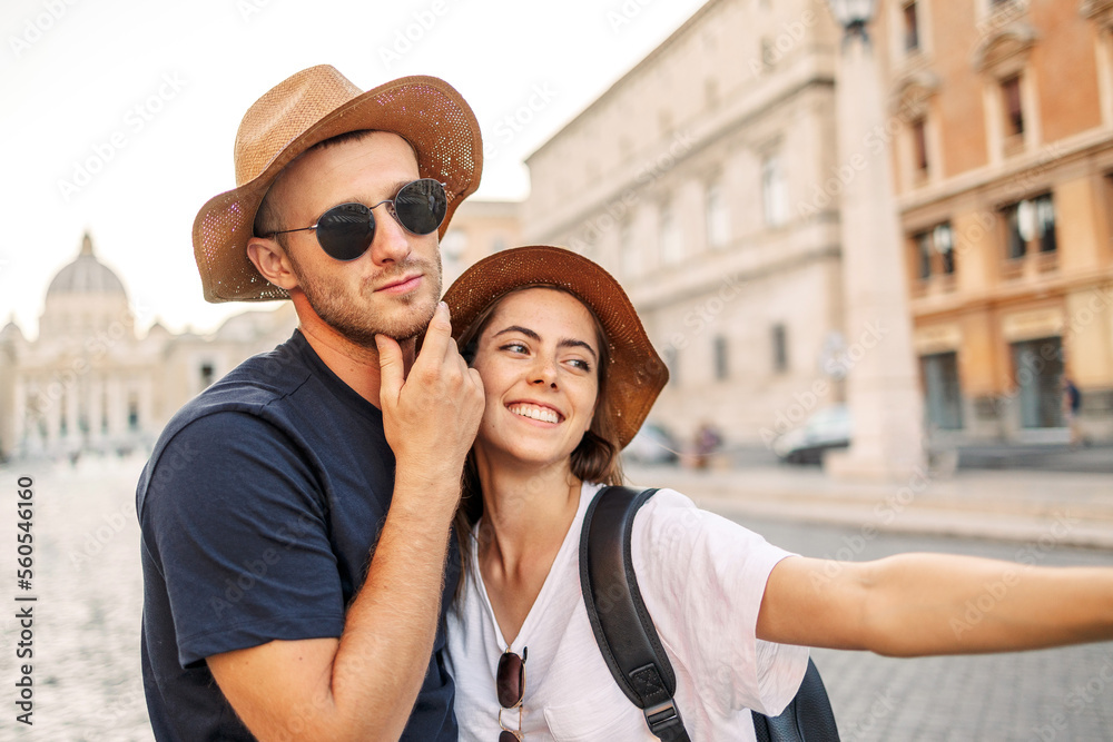 Happy Young couple taking selfie portrait with smartphone mobile outdoor. Tourism, friendship, youth and weekend activities concept. Close up portrait. Tourism, selfie photos, bloggers