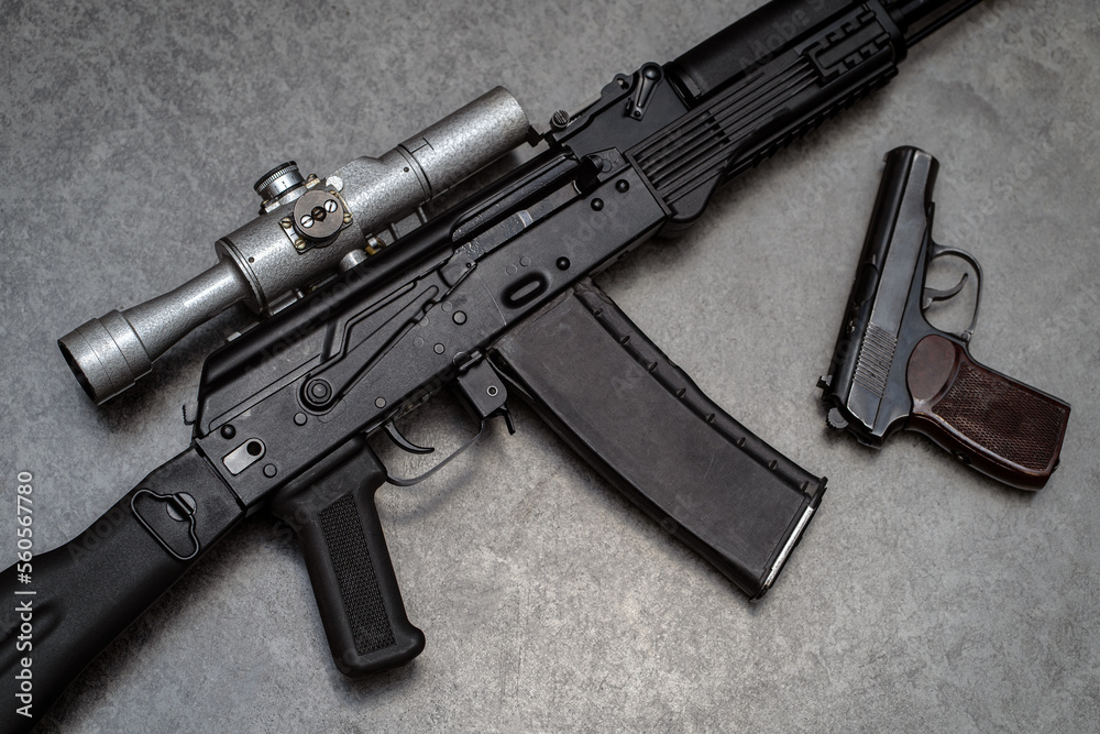 Russian weapons, ak-74m with a telescopic sight and a pm pistol, close-up photo.