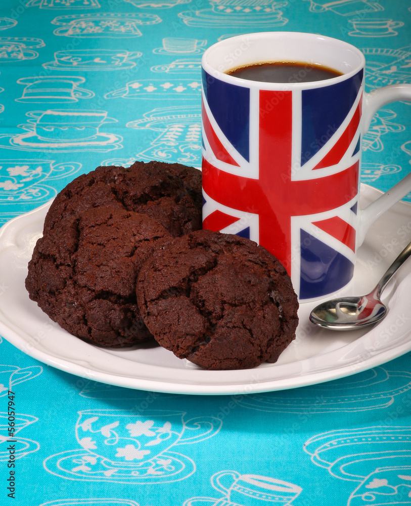 Dark Chocolat Cookies White Plate English Flag Mug Coffee