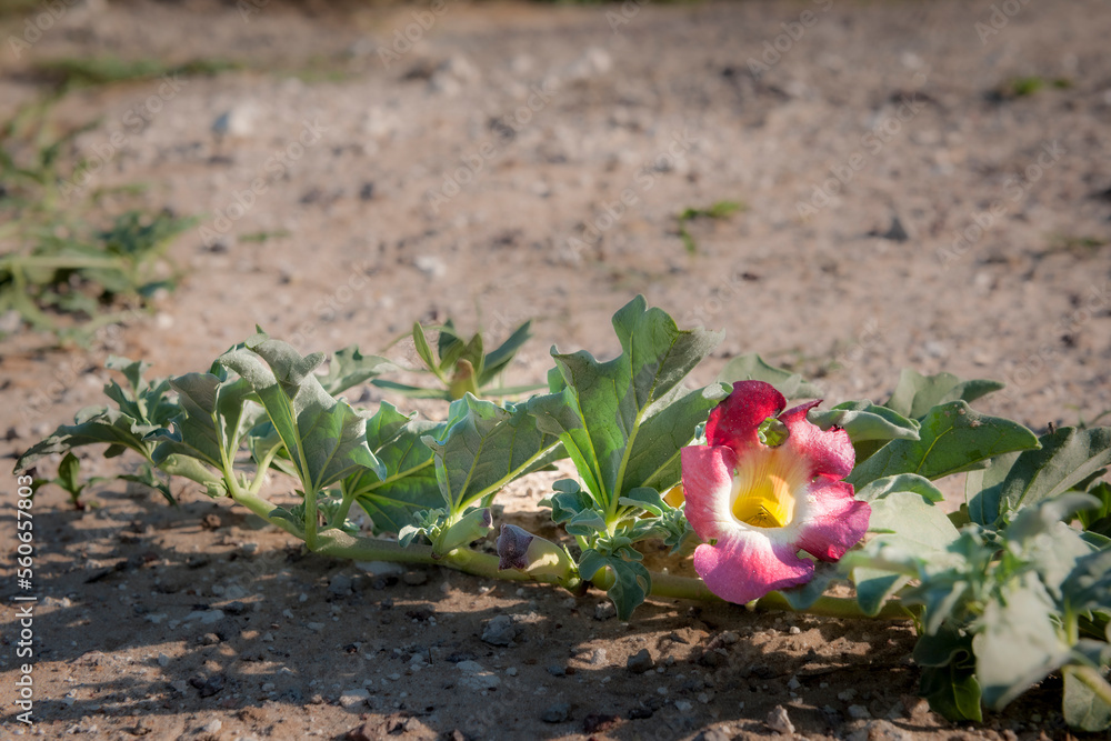 Devil’s Claw, grapple plant or wood spider, (Harpagophytum procumbens) medicinal plant and flower, a herbal remedy for the treatment of rheumatic conditions. Kalahari Desert. Botswana.
