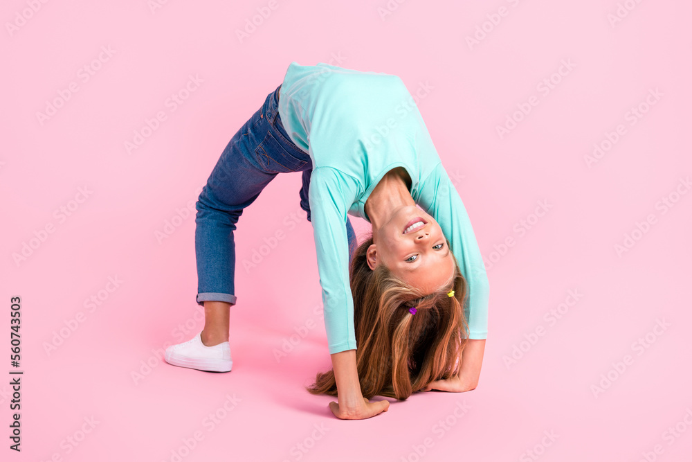 Full body portrait of cheerful nice schoolkid upside down make bridge isolated on pink color background