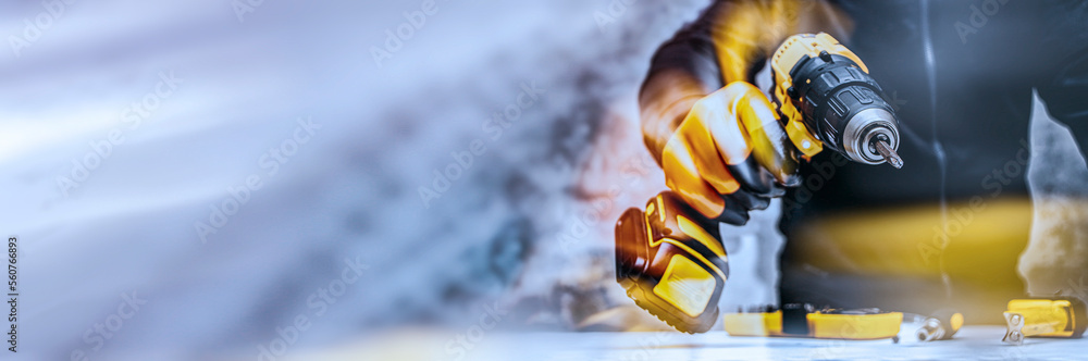 Man worker holds an electric screwdriver in his hands close-up against the background of a construction tool and a concrete wall. Long banner with glow effects.