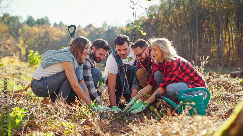 Team of friendly people in gloves planting tree seedling in garden and interacting for safe environment. Outside. Eco activists plant trees concept. Men and women volunteers for planet. Gardening.