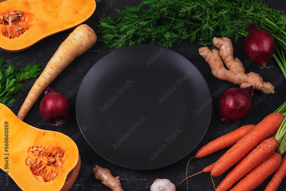 Black plate and vegetables, pumpkin. carrot, ginger, onion, parsnip and parsley on black background. Healthy raw vegan food. Top view, flat lay, mockup