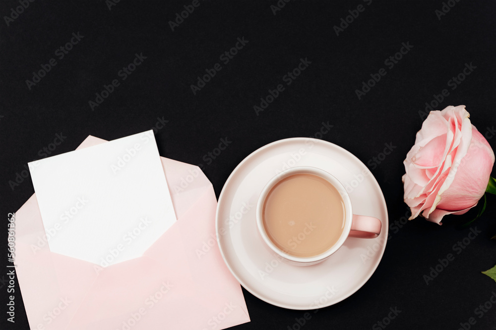 Coffee cup, envelope with blank card and pink rose on black background. Top view, flat lay, copy space