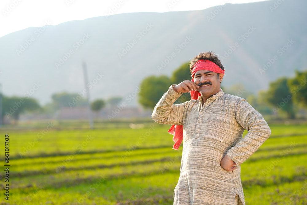 Happy Indian farmer standing at agriculture field.