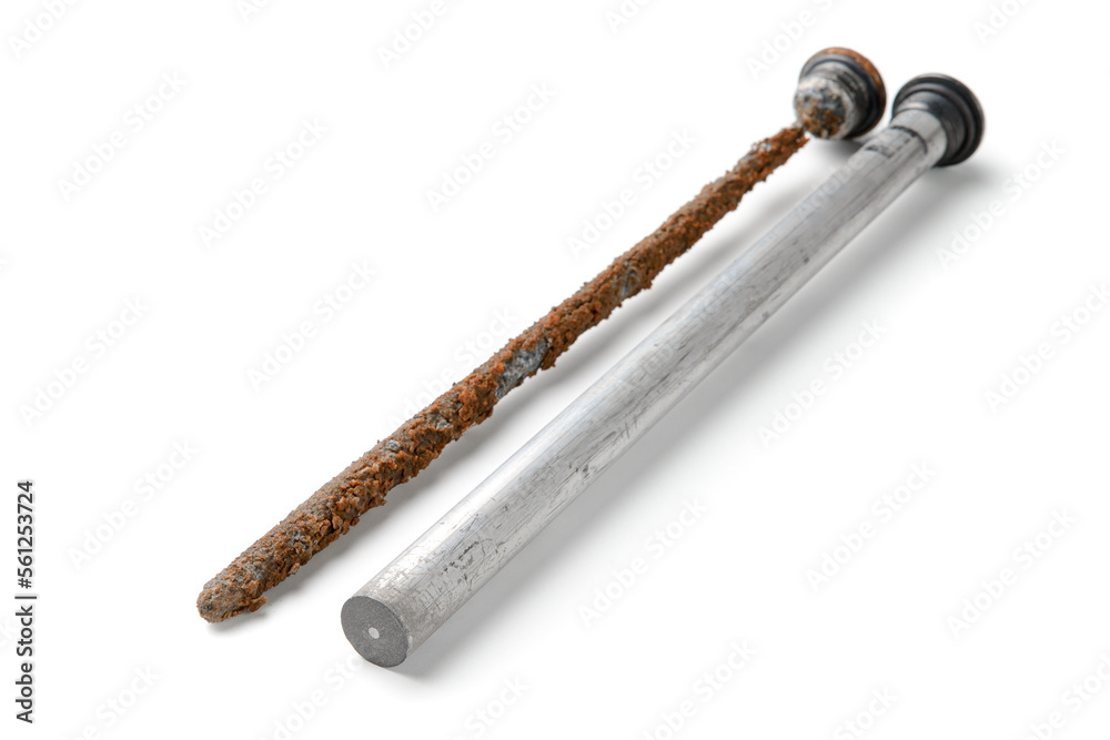 Rod to protect the boiler from rust on a white isolated background. Old and new magnesium anode lying side by side.