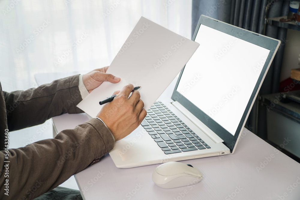 Bussinessman hand holding white paper and pen with blank screen laptop in office desk