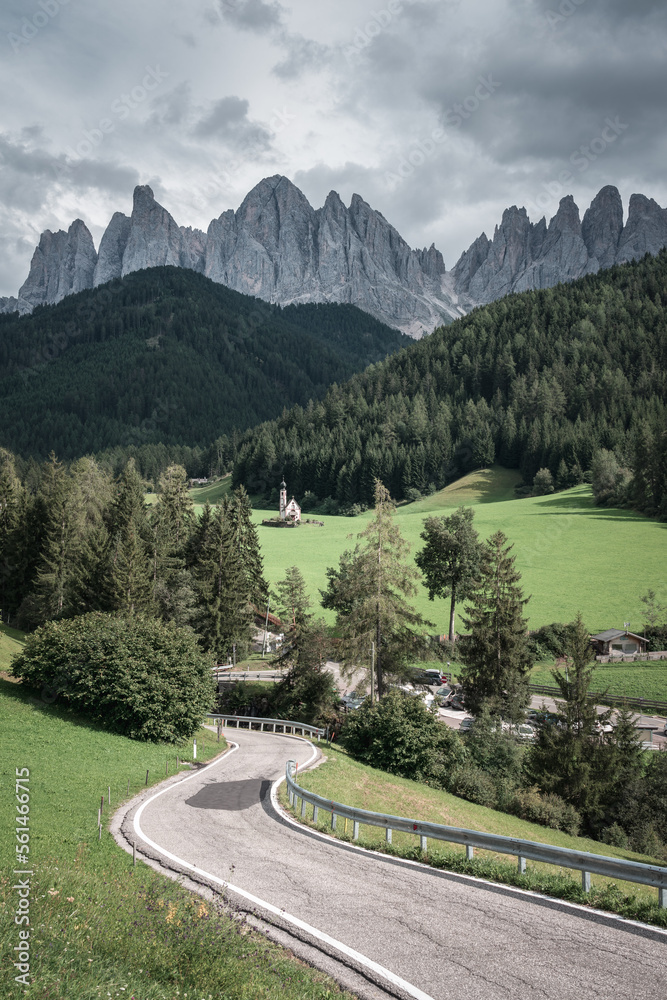 Straße in den Bergen mit Wiese und Kapelle und Bergmassiv in den Dolomiten.