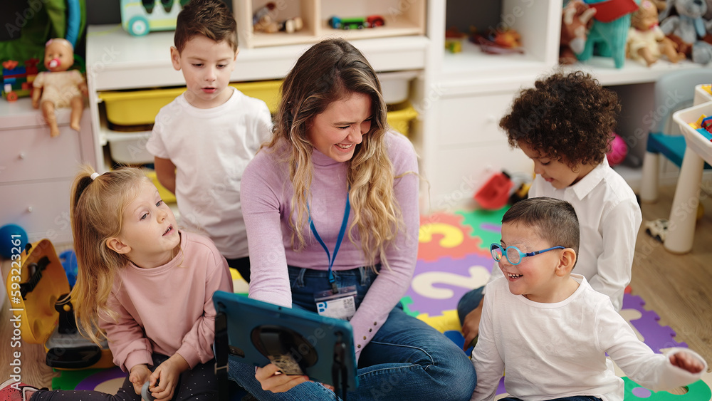 Adorable hispanic toddler playing with car toy sitting on floor at kindergarten