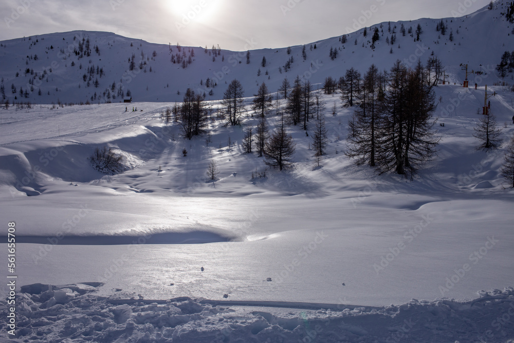 Winter snowy landscape. Nature scenery. Winter background. Alpine scenery.