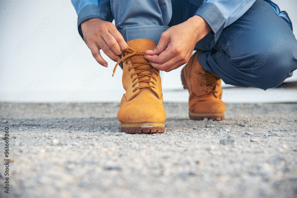 Man kneels down rope tie shoes industry boots for worker. Close up shot of man hands tied shoestring for his brown construction boots. Close-up man hands tie up shoes for footwear concept.