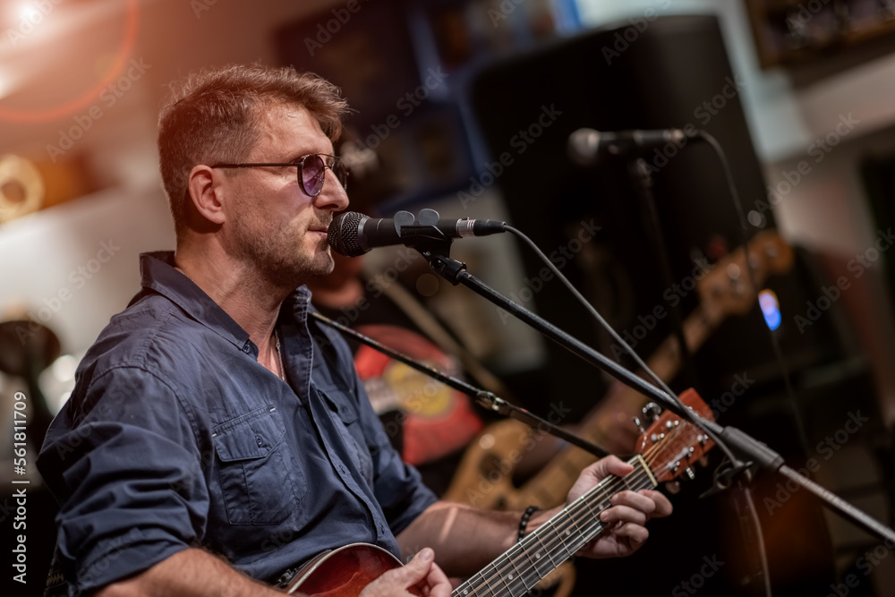 Band performs on stage, rock music concert.