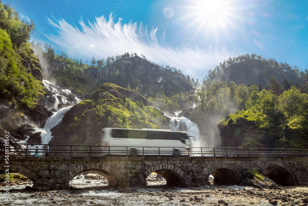 Tourist bus traveling on the road Latefossen Waterfall Odda Norway. Latefoss is a powerful, twin waterfall.