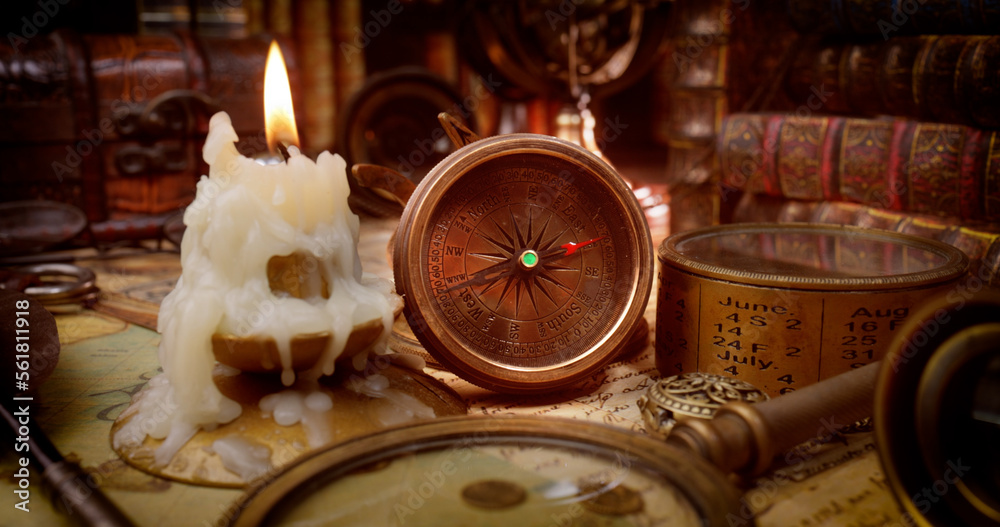 Vintage style travel and adventure. Vintage old compass and other vintage items on the table.